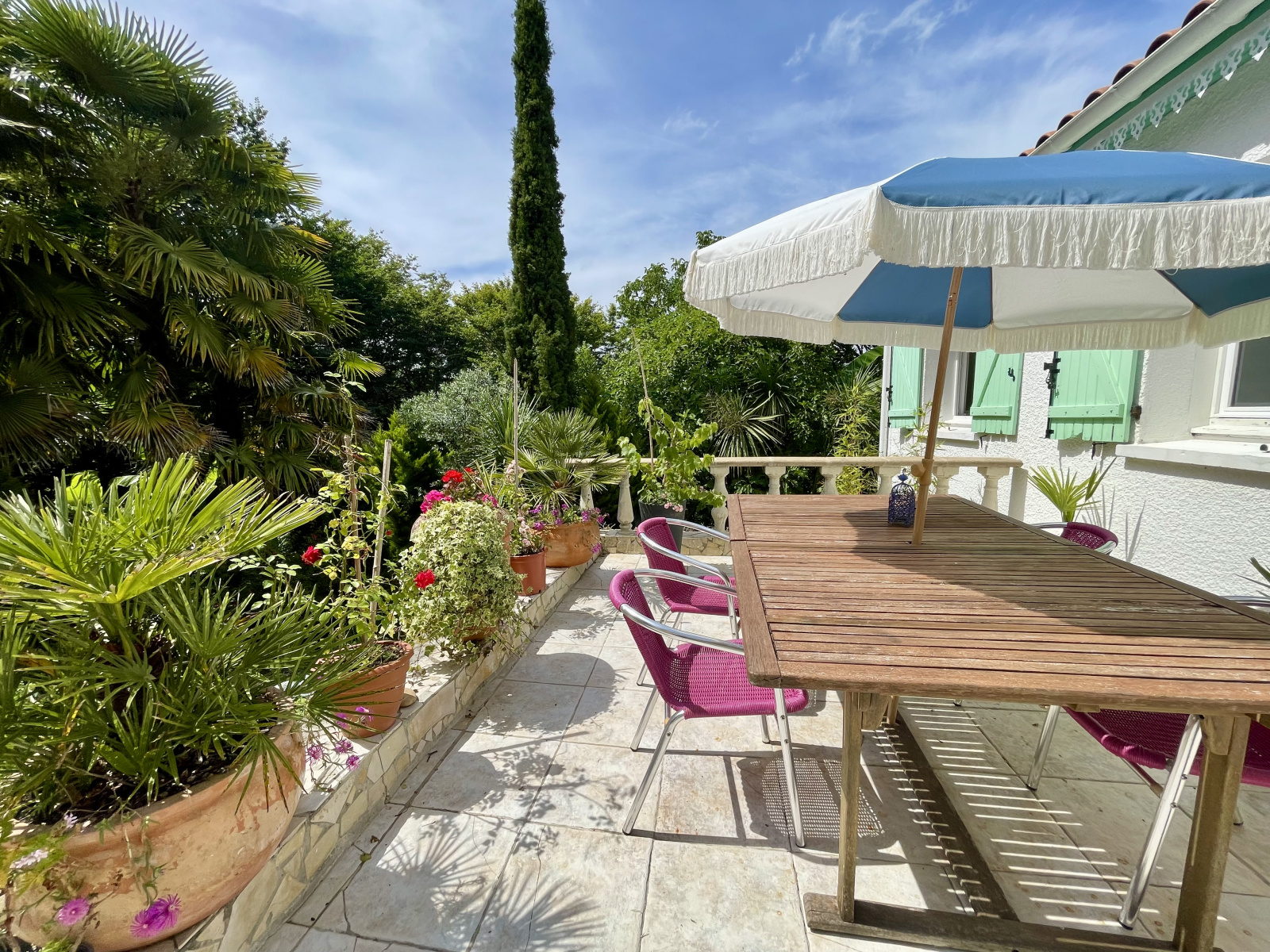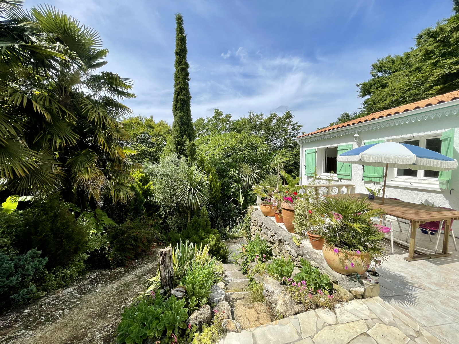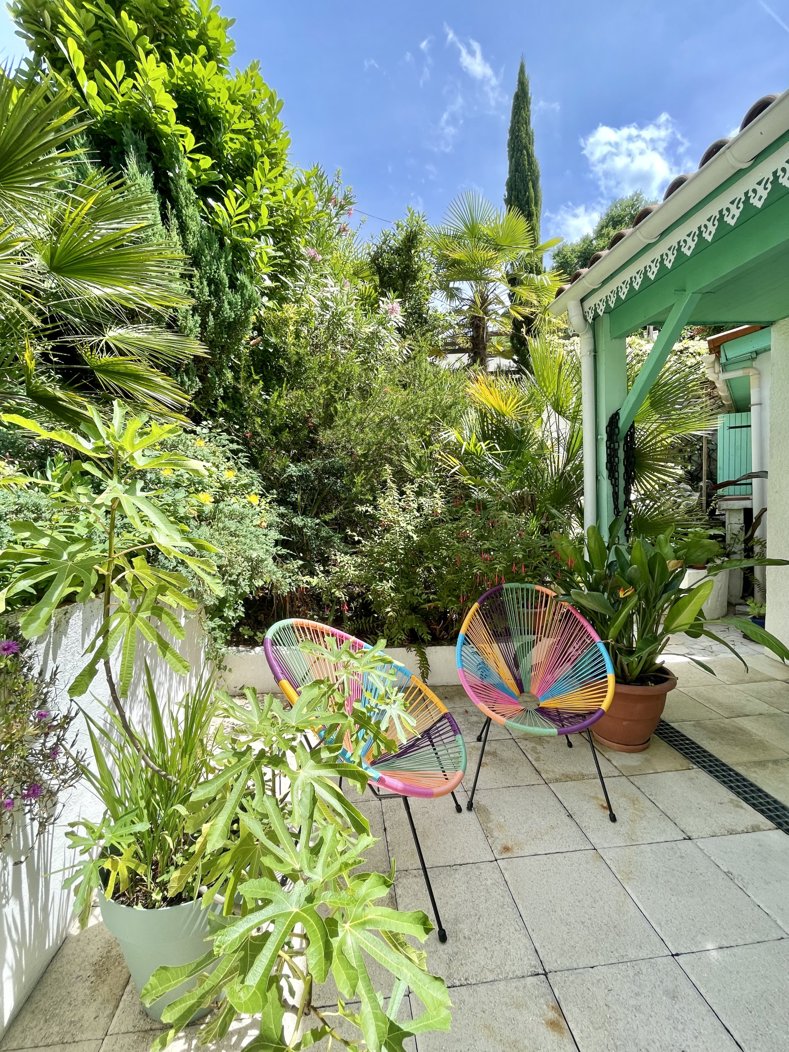 Le terrain en pente est magnifiquement arboré avec une variété d'arbres tropicaux, offrant une oasis de tranquillité et de fraîcheur. Ce jardin exotique est parfait pour les amateurs de nature. La maison dispose de TROIS TERRASSES. Charge de lotissement : 75 euros par an.
