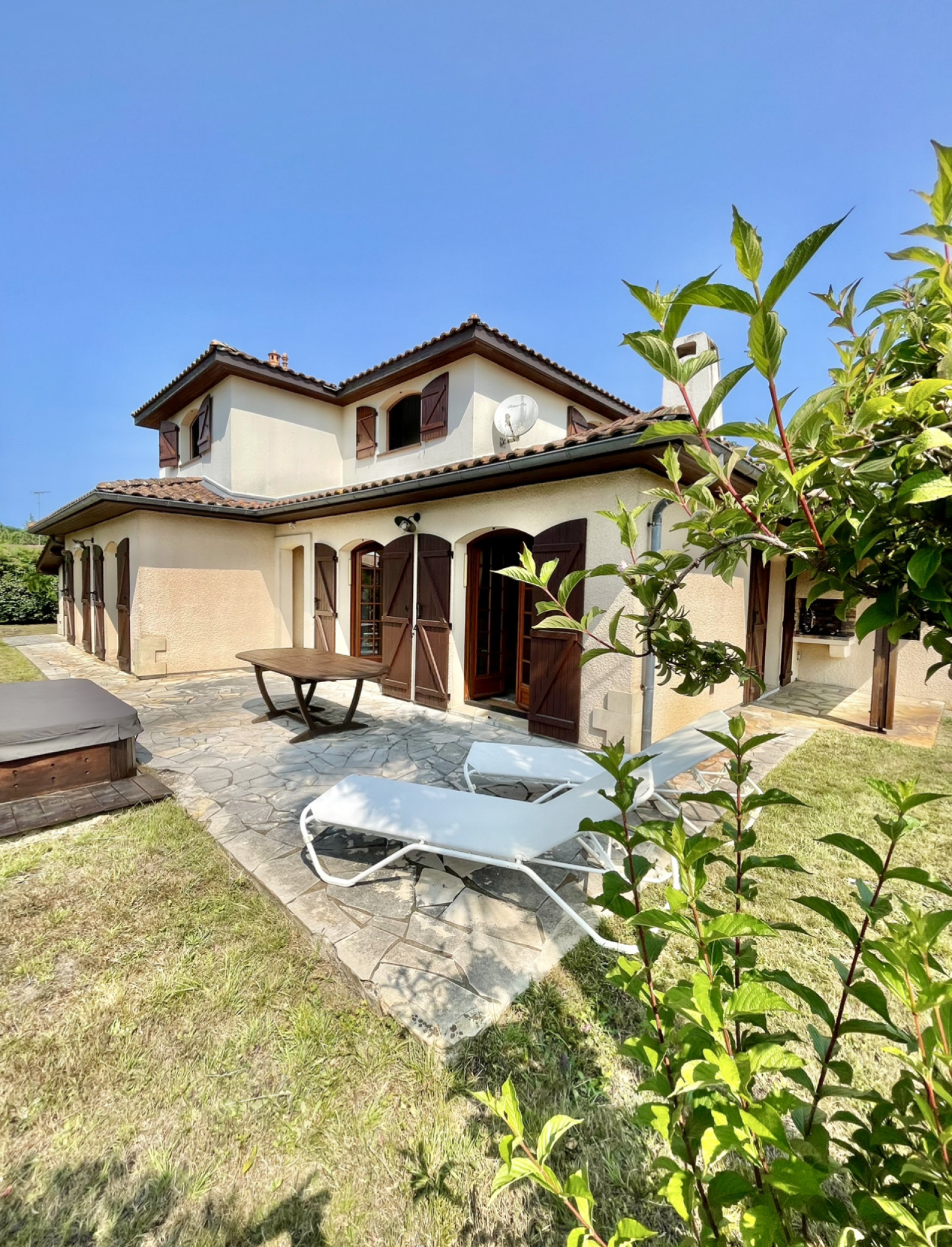 Le charme de l'extérieur ne manque pas à l'appel, avec une terrasse ensoleillée avec jacuzzi. Un cabanon vient ajouter une touche pratique à l'ensemble, offrant un espace de rangement supplémentaire.